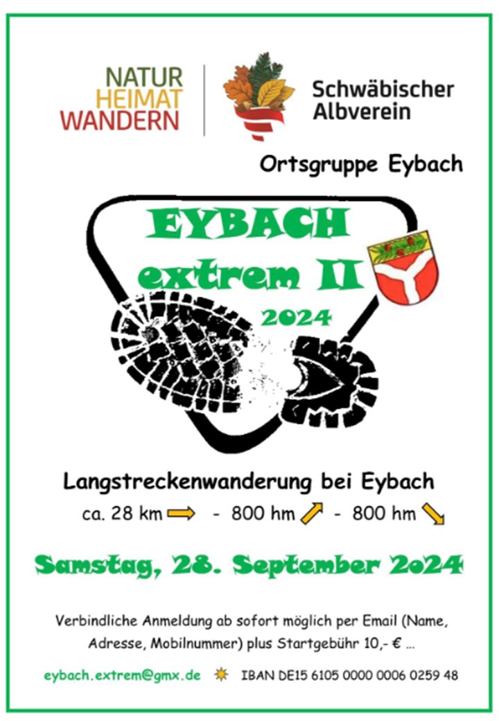 Eybach Extrem II Sa., 28.09.2024, Die Ortsgruppe Eybach lädt in diesem Jahr wieder zur Wanderung rund um den Ortsteil ein. Uhrzeit: Ganztägig iCalendar Mit dem Laden der Karte akzeptieren Sie die Datenschutzerklärung von Google.Mehr erfahren Karte laden Google Maps immer entsperren zur Übersicht